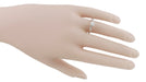 Romantic asymmetrical ribbon sides bordered with hand applied milgrain beaded edging frame the shoulders of the ring, embedded with 6 old single cut diamonds.