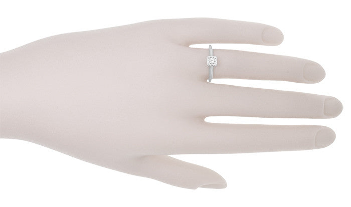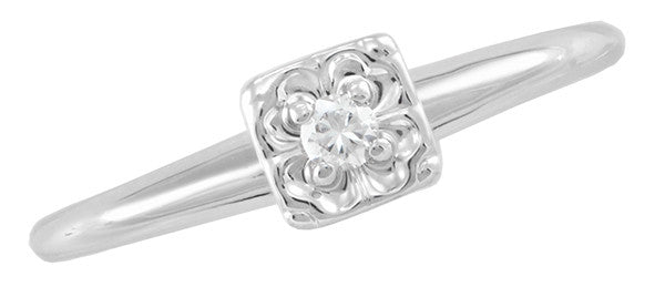 The simple and elegant illusion setting design makes the diamond appear square and much larger than its actual size, and the view from the top of the ring reveals antique clover engraved details around the center diamond. The smooth plain band of the ring makes this ring easy to match with a vintage band.
