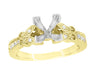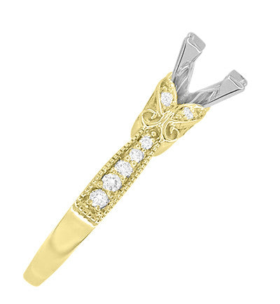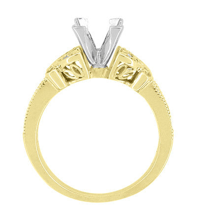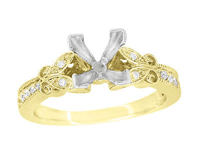 Crafted to order in classic 14K yellow gold, this lovely nature inspired heirloom semi-mount ring is sold without a diamond center stone to securely accommodate a square princess cut diamond of 6.6 - 7.0 millimeters in diameter (approximately 2 carat in weight).