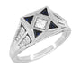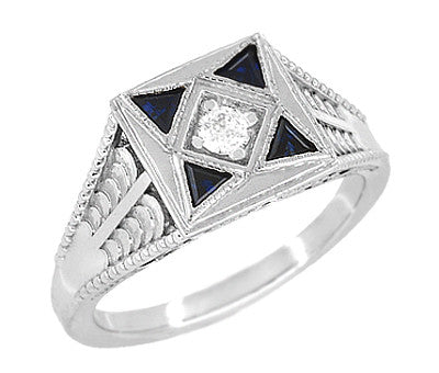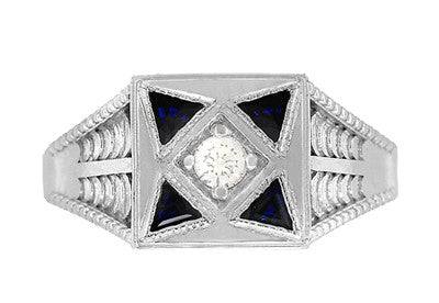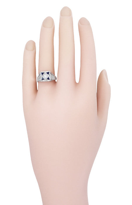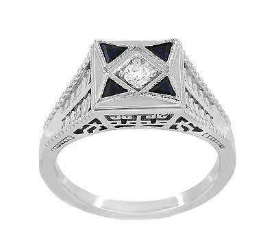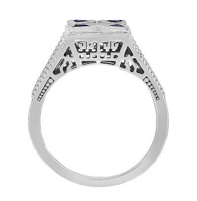Art Deco Engraved Filigree 4 Stone Blue Sapphire and Diamond Antique Style Ring in 18 Karat White Gold