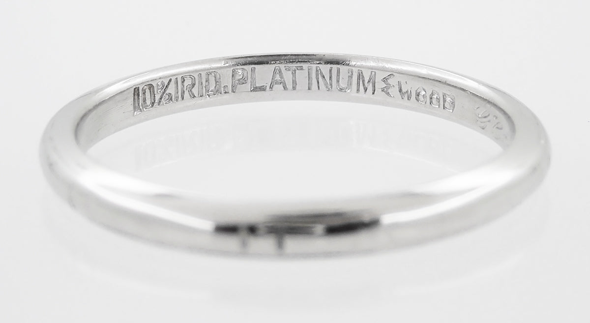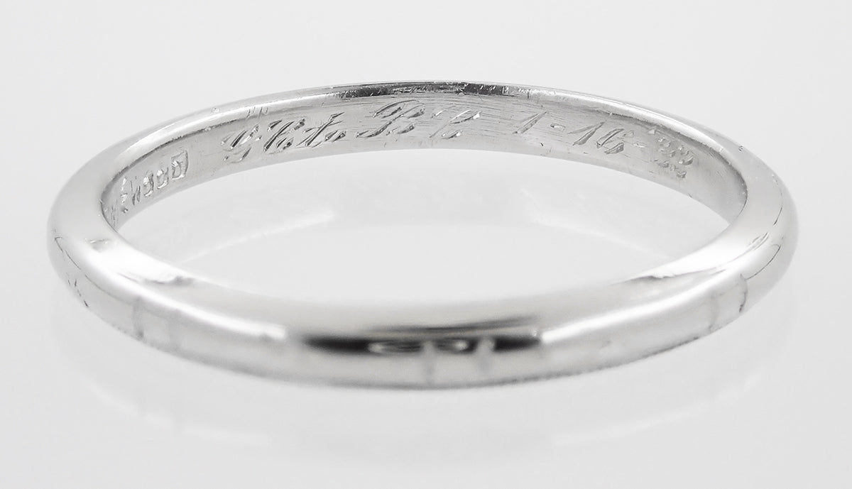 Inscribed with "GC to BC 1-16-'33" on the inside of the ring, this authentic one of a kind 1930's heirloom platinum wedding band also has an original hallmark on the inside of the band from the famous jewelry design firm J.R. Wood, originators of the famous ArtCarved jewelry brand.