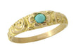 Circa 1900, this Victorian baby ring in 14K yellow gold features an engraved scroll pattern and is set with a cabochon turquoise gemstone. This one of a kind baby ring measures 3.88 millimeters wide and is a ring size 1.