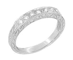 This substantial two ring Art Deco platinum bridal set features a gorgeous engagement ring semimount setting for a 1 1/4 carat princess cut diamond, and a matching diamond wedding ring. Finely detailed, the rings showcase a hand engraved ornate vintage scroll pattern on all 3 outward facing sides of each band, with light scattering milgrain on the edges.
