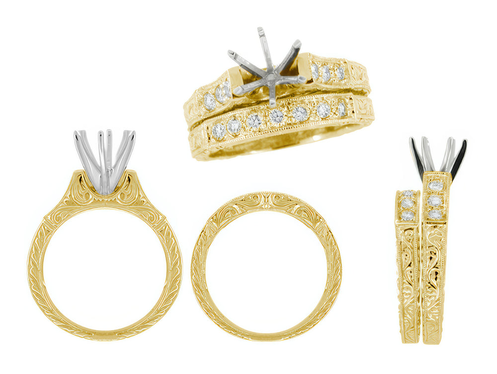 Hand-Engraved Scrolls Art Deco Engagement Ring Semimount for a 1.75 Carat Round Diamond with Matching Wedding Band - 14K or 18K Yellow Gold