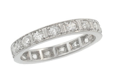 Circa 1930's, this flat vintage Art Deco platinum straight-line diamond wedding ring is crafted in a classic eternity diamond design with millegrain engraved outside edges. 17 shimmering single cut E/H color, SI/I clarity diamonds for a total diamond weight of 0.68 carats encircle this classic eternity ring. It 2.95 millimeters wide. Size 4 3/4.