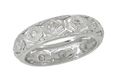 This original vintage Art Deco platinum wedding band is hand crafted in a delightful engraved geometric filigree design with millgrain edges. Set with 12 single cut diamonds for a total weight of 0.24 carat, this unique estate 1920's wedding ring measures 4.9 millimeters wide.