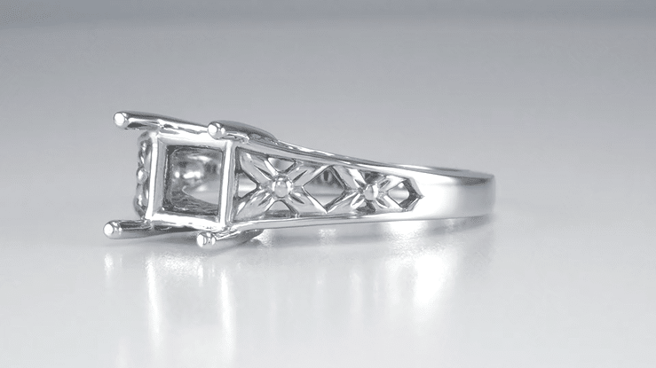 The perfect home for your Princess, Radiant, or Asscher Cut diamond, you can find the measurements for your gem shape below in order to confirm whether your stone can be set securely in this gorgeous heirloom semimount ring.
