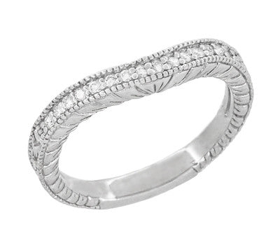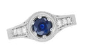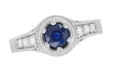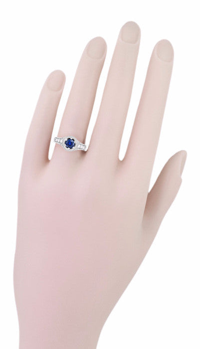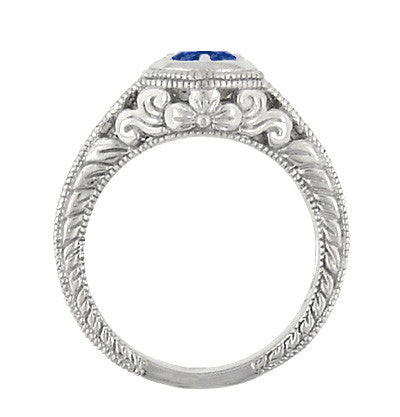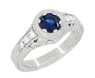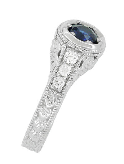Art Deco Filigree Flowers and Scrolls Engraved Blue Sapphire and Diamond Engagement Ring in White Gold