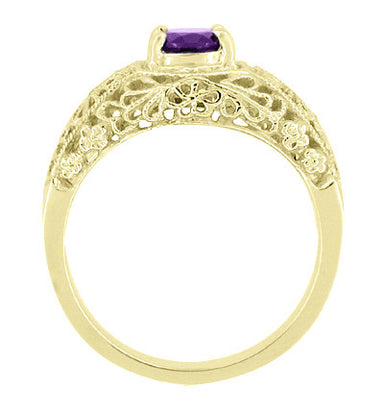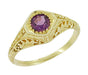 With its flush setting style and small low profile design, this uncommon filigree antique style yellow gold amethyst ring is perfect for anyone with smaller fingers or for a person who desires an exquisite yet easy to wear ring with a wealth of hand finished heirloom detail.