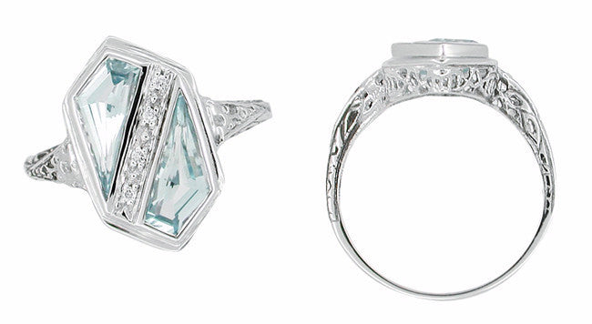 Art Deco Blue Topaz Royal Shield Filigree Ring in 14 Karat White Gold