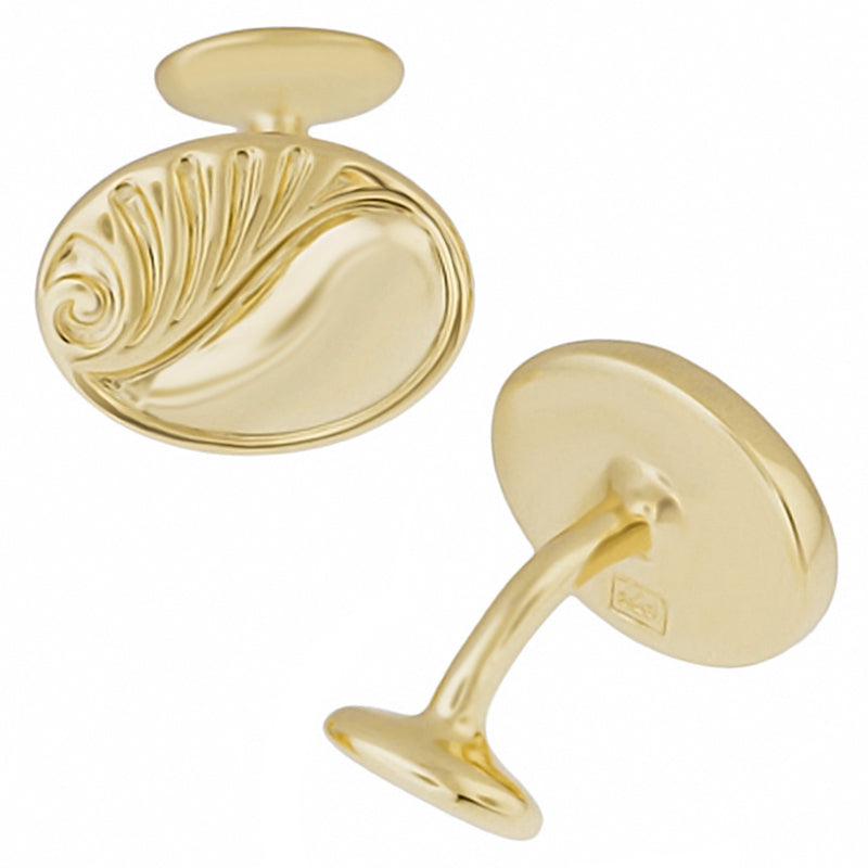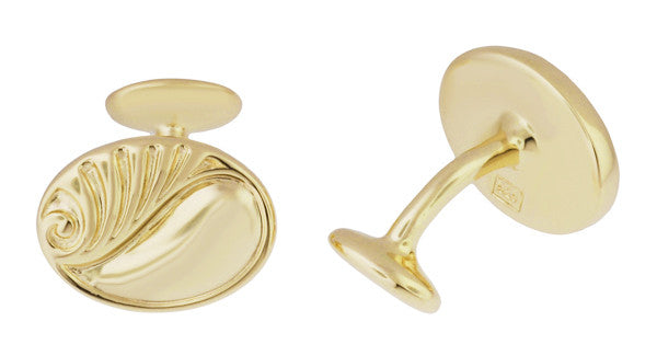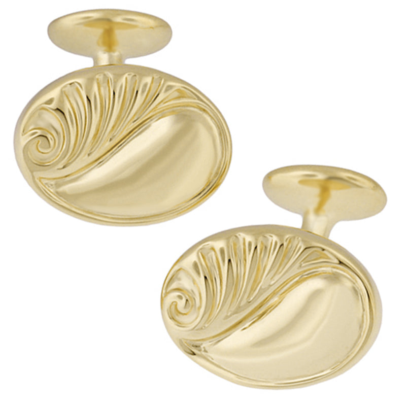 Featuring a classic asymmetrical scroll wave pattern, these handsome vintage design yellow gold finish cuff links have a high polish teardrop shaped center, perfect for your hand engraved initials. Heavy and solid, with a strong one piece construction for a lifetime of wear, they measure 3/4 inch wide by 1/2 inch high.