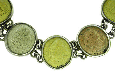 This Victorian lava cameo antique bracelet dates from the mid 1800's and features bezel set cameos depicting a female in profile, measuring 12.5 millimeters high and hand carved in yellow, gray and red lava. Made in Italy, the bracelet is hand finished in Sterling Silver and mesaures 7 inches long. These cameos show wear due to age which does not affect the wearability of this wonderful lava bracelet. A fabulous piece of ancient history to collect and wear!