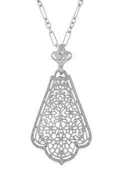 A treasure for the lover of pure filigree, this beautiful vintage style Art Deco filigree bracelet in sterling silver showcases a elegant and airy floral filigree open design. The center of the bracelet features a 0.025 carat natural diamond framed with a lovely filigree lozenge shape adorned with engraved leaves. Sculptural filigree links frame the center and complete the gorgeous design.