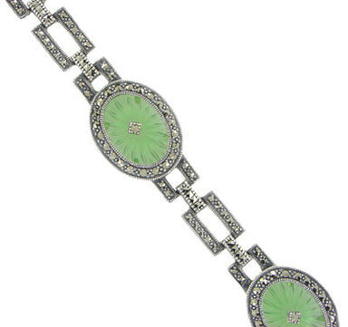 This bold Art Deco sterling silver link bracelet, awash in light scattering marcasite, showcases three dreamy frosted verdelite green starburst crystal oval panels, each measuring approximately 11/16 inch wide by 15/16 inch long.
