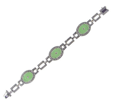 At the center of each crystal is a shimmering marcasite gemstone, with the ovals and bracelet links adorned with a total of 176 marcasite gemstones and light scattering millgrain edging for a wonderful finishing touch.
