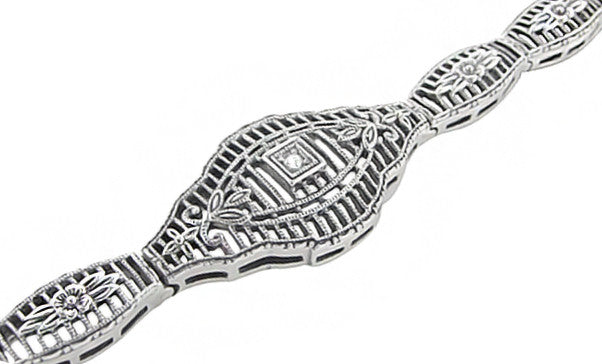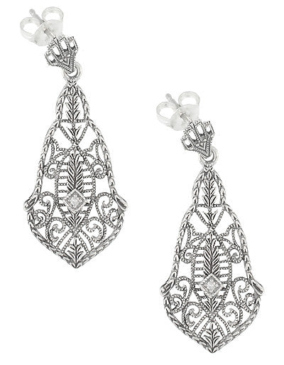 These gorgeous romantic Art Deco filigree earrings are hand crafted in sterling silver in lavish detail with an antiqued finish. The body of each earring dangles from a geometric filigree top for plenty of eye-catching movement. At the center of each filigree earring is a shimmering white 0.015 round brilliant diamond ( April Birthstone ) for a total diamond weight of 0.03 carat for the pair.