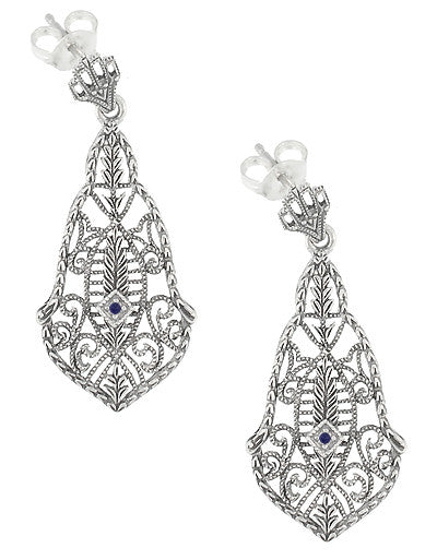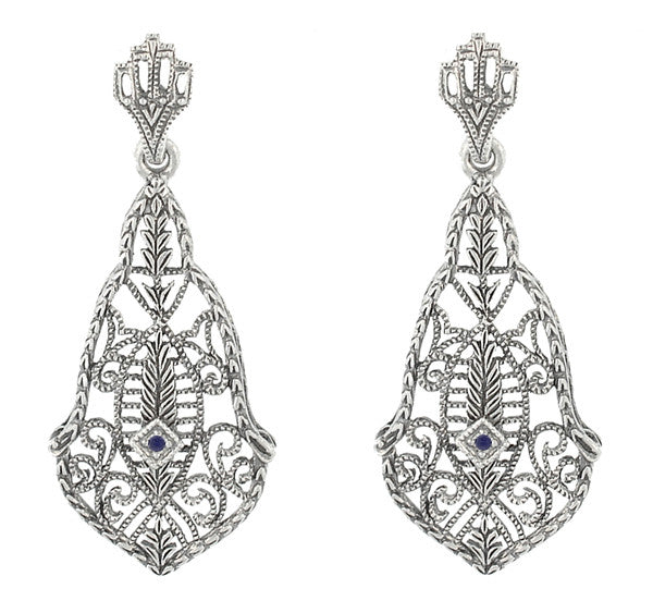 Art Deco Filigree Sapphires and Scrolls Dangling Earrings in Sterling Silver
