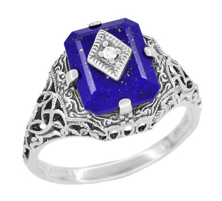 These lovely Art Deco lapis earrings in sterling silver feature bold and dramatic lapis lazuli set with 2 sparkling diamonds for a total of 0.01 carat, framed in beautiful intricately detailed carved filigree. Measuring 15/16 inch high by 7/16 inch wide, these wonderful original 1920's design earrings feature notched posts for security and comfortable butterfly backs. These unique silver heirloom lapis earrings are the perfect addition to a filigree lover's jewelry wardrobe.