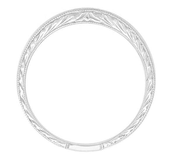 This slightly curved sterling silver Art Deco wedding ring features an antique carved wheat pattern on the 2 outward facing sides of the band, with light scattering beaded millgrain around the edges of the band.