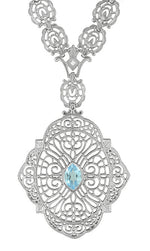 The shimmery large oval blue topaz is beautifully nestled atop an elegant lattice of sterling silver filigree accented with granulation, antique engraving, and bows.