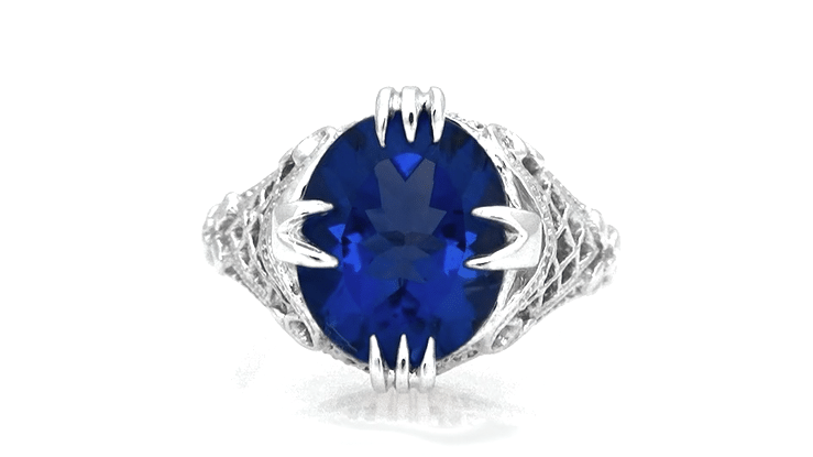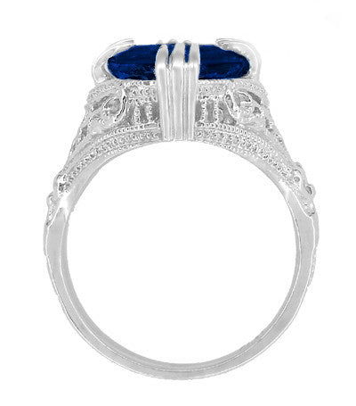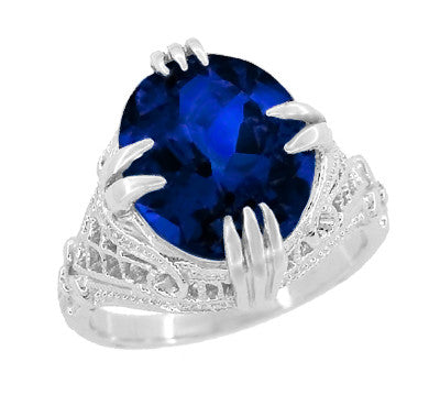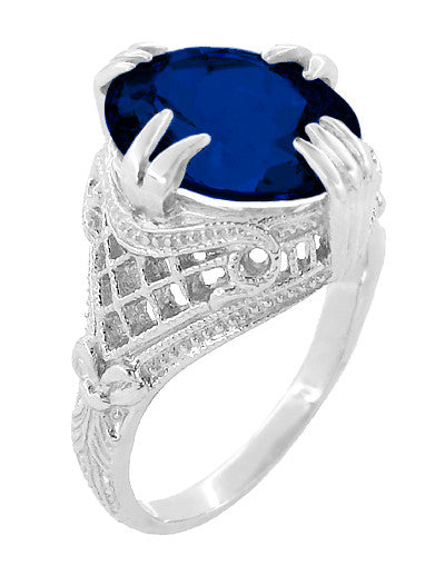 Art Deco Engraved Filigree 5.75 Carat Oval Lab Created Blue Sapphire Statement Ring in Sterling Silver