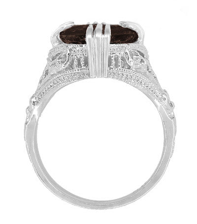 This bold vintage style Art Deco smoky quartz sterling silver filigree ring showcases a large 4.30 carat oval faceted chocolate brown color smoky quartz gemstone in a secure claw prong setting. Intricate filigree on the sides of the setting is accented with millgrain and artisan engraving down the sides of the band.