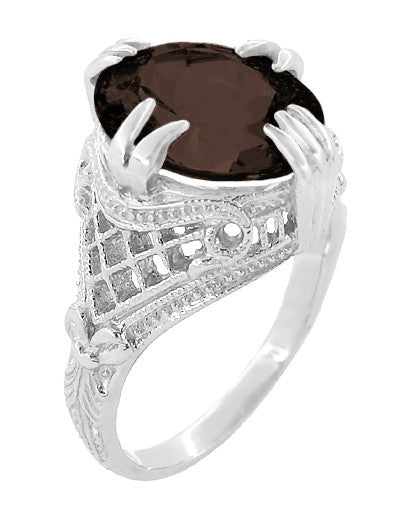 Art Deco Filigree Claw Prong Statement Ring - 4.30 Carat Oval Smoky Quartz Ring in Sterling Silver