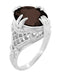 This bold vintage style Art Deco smoky quartz sterling silver filigree ring showcases a large 4.30 carat oval faceted chocolate brown color smoky quartz gemstone in a secure claw prong setting. Intricate filigree on the sides of the setting is accented with millgrain and artisan engraving down the sides of the band.