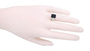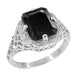 This bold 1920's Art Deco vintage filigree onyx ring design in sterling silver features a bold emerald cut natural black onyx gemstone in a secure four prong setting.