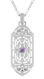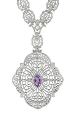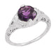 This stunning Art Deco engraved amethyst promise ring in sterling silver features a shimmering 1.10 carat round natural purple amethyst ( February Birthstone ) securely 4 prong set atop a delicate cage of open filigree.