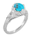 This stunning Art Deco turquoise promise ring in sterling silver features a vibrant blue cabochon natural turquoise gemstone ( December Birthstone ) of 1.15 carats securely 4 prong set atop a delicate cage of sterling silver filigree.