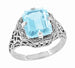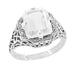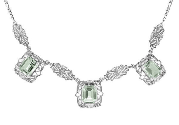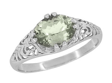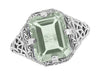 This classic antique style Art Deco filigree prasiolite green amethyst ring features a dreamy pastel green rectangular emerald cut prasiolite gemstone of 2.40 carats.