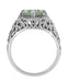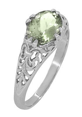 This classic green amethyst ring is crafted in delicate sterling silver pierced vintage filigree and hand finished with finely detailed flowers, vines, and leaves. The perfect gift for a girl who loves green, this beautiful filigree prasiolite (green amethyst) ring is sure to be admired!
