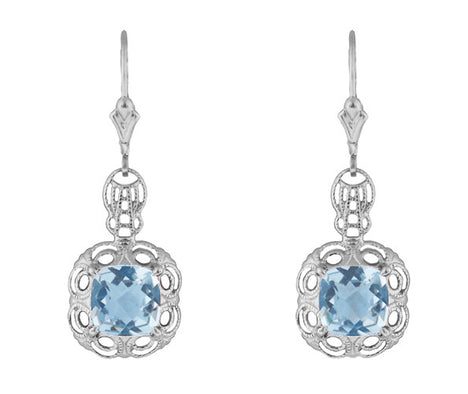 This antique reissue silver blue topaz filigree ring features a low profile with a securely bezel set center blue topaz gemstone ( December Birthstone ) - an excellent choice for anyone who would like a ring with antique detail, which will not "catch" on things and get in the way of a busy daily routine.