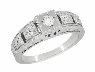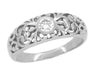 For complete ease of wear, the band gradually tapers from 6.5 to 2 millimeters wide, and this antique low profile silver filigree white sapphire promise ring design features a securely bezel set flush center gemstone, making it an excellent choice for anyone who would like a ring which will not "catch" on things and get in the way of a busy daily routine.
