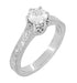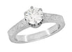 A romantic antique engraved scroll pattern on the three outward facing sides of the ring is bordered with hand carved light scattering millgrain beaded edging.