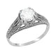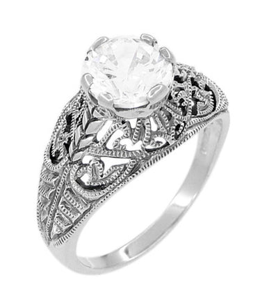 Finely crafted with delicate pierced filigree and hand finished detail, this lovely Art Deco CZ solitaire ring is an exact reproduction of an original antique engraved ring. This classic vintage 1920's style cubic zirconia promise ring is sure to be appreciated for its timeless style.