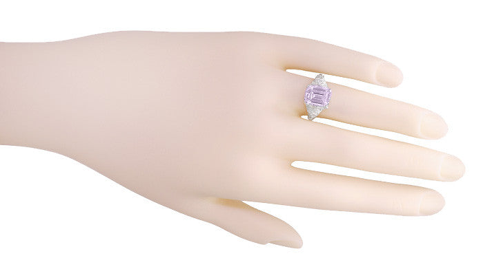 The pretty lavender 2.40 carat natural rose de france amethyst emerald cut stone radiates from the center of this beautiful Edwardian statement ring, perfect for wear as a rose de france cocktail ring.