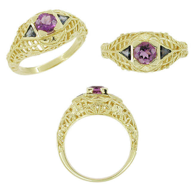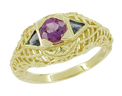 Art Deco Amethyst and Triangle Blue Sapphire Filigree Ring in 14 Karat Yellow Gold
