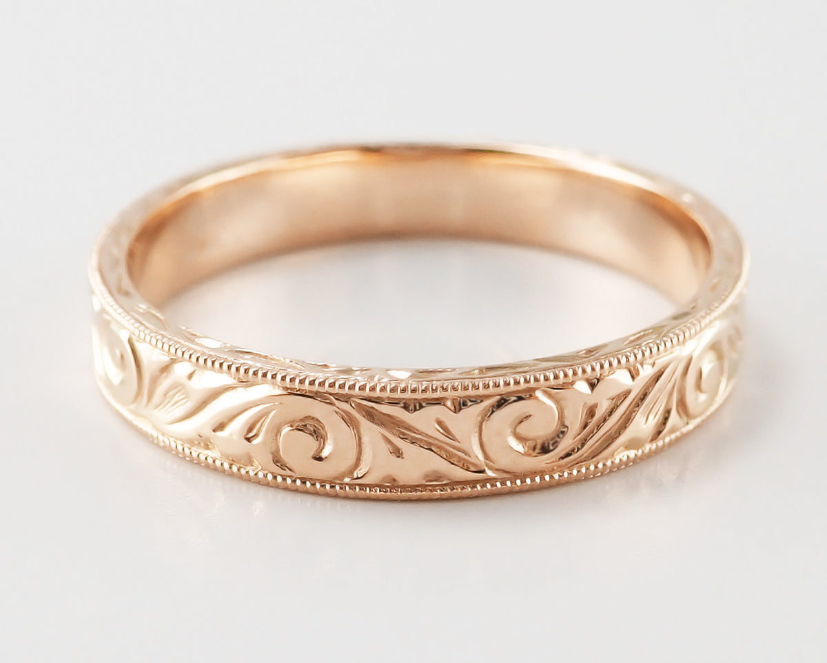 This rose gold scroll engraved wedding band measures 4.0 millimeters wide and sits close to the finger at 1.3 mm high off the finger, giving it a comfortable fit for a lifetime of everyday wear.