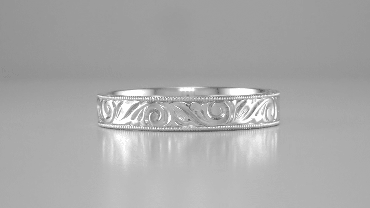 This scroll engraved wedding band measures 4.0 millimeters wide and sits close to the finger at 1.3 mm high off the finger, giving it a comfortable fit for a lifetime of everyday wear.