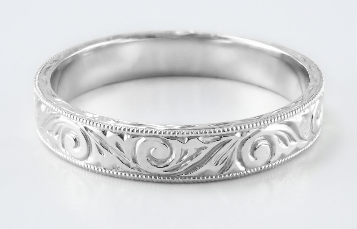 Men's Art Deco Scrolls Vintage Engraved Wedding Band in 10, 14 or 18 Karat White Gold - 4mm Wide