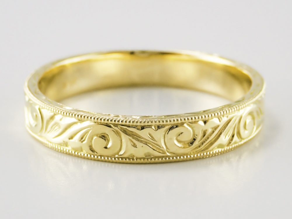 With an easy-to-wear low profile, it sits close to the finger for a comfortable fit that's sure to be appreciated. This classic yellow gold scroll engraved wedding ring is made to order in your choice of 10K, 14K or rich 18K yellow gold. Measures 4 millimeters wide.