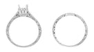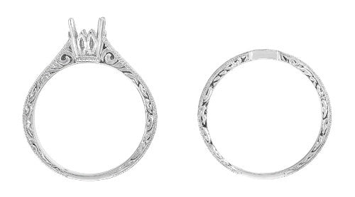 This classic Art Deco antique style scrolls wedding ring is meticulously hand crafted in platinum, and features a romantic engraved scrolls pattern on all three sides of the band, framed by light scattering millgrain edging for a wonderful finishing touch. This wedding ring is designed to coordinate with our Art Deco Crown Filigree Scrolls Engagement Ring Settings in Platinum, and the contoured notched top inside of this wedding ring is smooth where it fits around the top of the engagement ring so that it will not wear against the design and engraving at the top sides of the engagement ring.