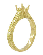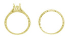 This wedding ring is designed to match with our Art Deco Crown Filigree Scrolls Engagement Ring Settings in 14 and 18 Karat Yellow Gold, and the contoured notched top inside of this wedding ring is smooth where it conforms around the top of the engagement ring, so that it will not wear against the design and engraving at the top sides of the engagement ring.