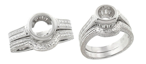 This classic Art Deco antique style curved wedding ring is meticulously hand crafted in luxurious platinum, and features a romantic engraved wheat pattern on all three sides of the band, framed by light scattering millgrain edging for a wonderful finishing touch. Measuring 2.8 millimeters wide, it rises 2.5 millimeters off the finger.