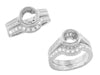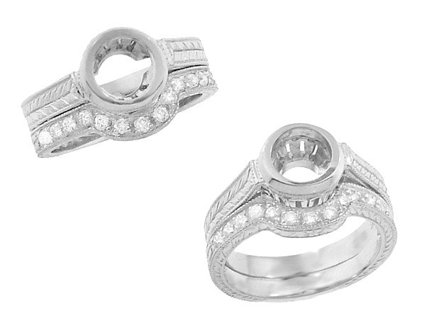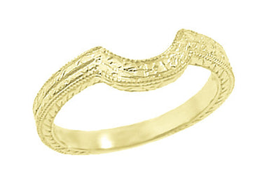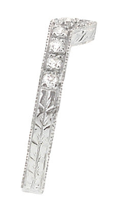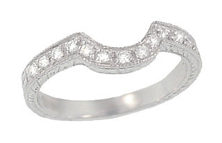This wedding ring is designed to beautifully complement item R306W1, and the contoured top inside of this exquisitely detailed diamond curved wedding band is smooth in the area where the rings will fit together, so that it will not wear against the design and engraving at the top sides of the matching engagement.
