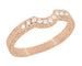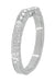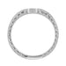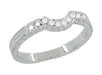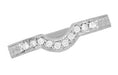 This lovely Art Deco antique style engraved curved diamond wedding ring in white gold features romantic wheat engraving on all three sides of the band, framed with light scattering millgrain edging for a wonderful finishing touch. A shimmering row of 10 round brilliant cut diamonds of VS clarity and F/G color are securely four prong set into the top of the band. Total diamond weight for the ring is 0.10 carat.