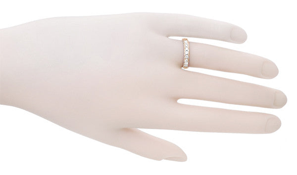 This classic Art Deco 14K rose gold engraved diamond wedding band is set with 8 shimmering round brilliant cut diamonds ( April Birthstone ) of F/G color and VS clarity, for a total diamond weight of 0.17 carat for the ring. The three outward facing sides of this 1920's vintage rose gold wedding ring design are decorated with a classic hand carved scroll pattern, with shimmery hand beaded millgrain edging framing the edges of the band.