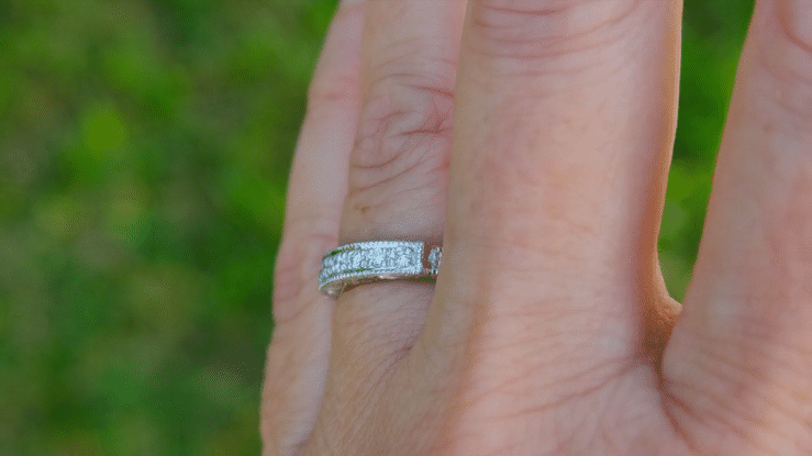 Measuring 3.4 millimeters wide at the top of the ring, this classic engraved diamond wedding band tapers down to 3 millimeters at the bottom of the ring, and rises 3.3 millimeters off the finger.